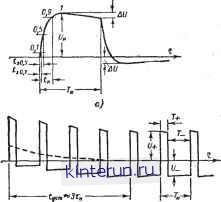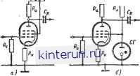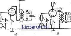Автоматическая электрика Распространение радиоволн /а.ср. В результате этого должна несколько измениться и динамическая анодно-сеточная характеристика лампы, после уточнения которой можно дополнительно скорректировать форму выходного сигнала и, действуя методом последовательных приближе- Рис. 10-18. Переходная характеристика усилителя с резистивно-емкостной связью. НИИ, приблизиться к точному решению задачи о положении линии нагрузки для переменного тока при больших амплитудах усиливаемых сигналов. В практических расчетах принято органичиваться нулевым ![]() Рис. 10-19. Искажения прямоугольных импульсов в усилителе с резистивно-емкостной связью. (i - одиночный импульс; б - переходные искажения при появлении серии импульсов. приближением, т. е. использовать прямую MN, проведенную через начальную рабочую точку А. При обычных требованиях к линейности усилителя (например, i<r<107o) погрешности такого приближения не имеют практического значения. Динамическая анодно-сеточная характеристика или семейство анодных характеристик с нанесенной на него линией нагрузки позволяет рассчитать коэффициенты гармонических искажений (см. стр. 489). Переходная характеристика (нормированная) коэффициента усиления по напряжению каскада с резистивно-емкостной связью при обычных соотношениях Ср > Си и Тн > Тв представляет собой разность двух экспонент (рис. !0-18): й*(/)=4=Г-н ,~ (10-53) ![]() где Тн и %в - введенные выше (стр. 463) низкочастотная и высокочастотная постоянные времени. Таким образом, Тв одновременно является постоянной времени нарастания (н на рис. 10-5), а Тн - постоянной времени спада (о на рис. 10-5). Переходные искажения при усилении одиночных импульсов (рис. 10-19,й) выражают конечным временем нарастания выходного импульса, спада плоской части вершины и появлением напряжения обратной полярности по окончании входного импульса. Время запаздывания, отсчитываемое на относительном уровне 0,1 или 0,5, составляет соответственно: <з 0.1 =0.104: <3 0.5 =0.69Т. (10-54) (10-54а) Время нарастания от уровня 0,1 до уровня 0,9 (10-55) Спад вершины и пик напряжения обратной полярности по окончании импульса равны друг другу. Обычно их оценивают в процентах от максимального напряжения импульса: / и\ At/ / б=1ОО-гг- = 100 1 -е 100- (10-56) где Ги - длительность импульса. Приближенное соотношение справедливо при Г <0,1Тн. Искажения среза импульса в отсутствие перегрузки усилителя аналогичны искажениям фронта. Неравенства ТвУиСТн являются условиями малых искажений прямоугольных импульсов. Необходимые постоянные времени Тв и Тн можно определить по заданным нормам на искажения при помощи следующих формул: в-;ГГ.- (10-55а) Тн> 100 (10-56а) Пример 2. Рассчитать ламповый каскад с резистивно-емкостной связью по заданным переходным характеристикам: н0,5/гксел:; в 2% при Г =100 мксек; Ко>20; Сн= =20 пф; /?в=0,5 Мом. Решение. С помощью формул (10-55а) и (10-56а) определяем необходимые постоянные времени: 0,5 к Тв<-= 0,227 мксек и 0,23-10 сек; т > 300. = 5ООО мксек = 5-10~ сек. Сопоставляя эти данные с результатами расчета в примере 1, легко обнаружить, то рассчитанный ранее усилитель удовлетворяет требованиям к величине Тв, а для достижения нового значения Тв потребуется существенное уменьшение нагрузки а. В соответствии с (10-39) максимально допустимое значение jRbkx составляет: 0,23-10-е 30.10- ,-12 = 7 600 от. Поскольку Rt, Rb > йвых, уместно выбрать Ra~7 ком и считать Rn.a~Ra. при этом коэффициен