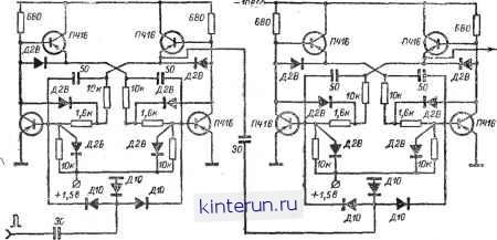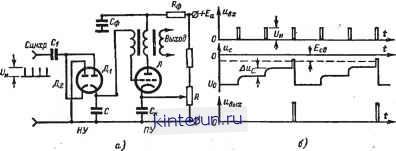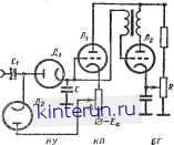Автоматическая электрика Распространение радиоволн правого триода лампы Л, мультивибратор синхронизируется в течение полупериода, соответствующего запертому состоянию этого триода (поскольку эти пики заставляют преждевременно опрокидываться мультивибратор после прохождения каждого п-то импульса). В течение второго полупериода. 1.В. >Jjilj63-ттттт rty j6X2n ежгп 110к С 270 leoK -1-0 Выход 210в е,8к Рис. 11-104. Делитель частоты следования импульсов на фантастроне. Л, Л-диаграммы напряжений на аноде и катоде пентода. когда этот триод отперт, диффернцирован-ные импульсы усиливаются и, поступая через конденсатор Сз на сетку запертого правого триода лампы Лг, своими положительными пиками осуществляют синхронизацию мультивибратора , вызывая преждевременный переброс схемы. Напряжение с анода правого триода Лг поступает на цепь формирования Ф, где происходят дифференцирование перепадов напряжения и срезание отрицательных или положительных пиков. В результате общий коэффициент деления, регулируемый резистором R, оказывается равным Anjtiij. Аналогично устроены делители на транзисторных мультивибраторах. Деление частоты повторения можно осуществить также с помощью фантастронных схем. Вследствие больщой стабильности работы коэффициент деления в практических схемах достигает 10 в одном каскаде. В схеме декадного делителя (т. е. делителя на 10, рис. 11-104) входные импульсы отрицательной полярности с амплитудой порядка 10 в через диод Д поступают на анод и (через конденсатор С) управляющую сетку пентода, запуская фантастрон. Длительность импульса фантастрона при выбранных параметрах регулируется так, чтобы очередное опрокидывание фантастрона вызывал каждый девятый импульс. Очередной запуск схемы возможен после окончания процесса установления напряжения на аноде пентода, в течение которого практически поступает еще один десятый импульс синхронизации. При указанных параметрах деление осуществляется с 1 кгц до 100 гц. При увеличении емкости конденсатора С до 2 700 пф фантастрон осуществляет деление частоты со 100 гц до 10 гц. Делители частоты с накопительным конденсатором и схемой сравнения. Импульсы, поступающие на схему делителя (рис. 11-105, а), должны иметь одинаковую амплитуду и не сильно различаться по длительности. В момент действия первого импульса диод Д] отпирается и происходит быстрый заряд конденсаторов Ci и С в накопительном устройстве НУ. После окончания импульса конденсатор Ci разряжается, а заряд на конденсаторе С сохраняется. При поступлении второго импульса напряжение на конденсаторе С вновь возрастает на несколько меньщую величину, и когда оно достигнет порога срабатывания схемы сравнения (-Есо на рис. 11-105,6), на выходе этой схемы появляется импульс. Обычно в качестве схемы сравнения (порогового устройства) используется заторможенный блокинг-генератор. В момент достижения напряжения отпирания лампы Л блокинг-генератора возникает импульс и сеточный ток лампы одновременно перезаряжает конденсатор С до определенного исходного напряжения Uo. С помощью потенциометра R устанавливается исходное запирающее напряжение, определяющее коэффициент деления. По мере увеличения числа импульсов приращение напряжения на конденсаторе С (величина ступеньки Дис) от импульса к импульсу уменьшается вследствие падения ![]() Рис. 11-105. Делитель частоты с нако