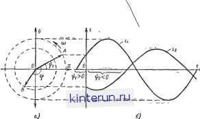 Автоматическая электрика Распространение радиоволн Величина индуктивности определяется геометрической формой и размерами проводника. Наиболее сильно индуктивность проявляется когда провод намотай на к а -тушках. В качестве примера вычислим индуктивность L длинной катушки из N витков (рис. 4-18). Ток /, протекающий по катушке, создает внутри ее магнитное поле с индукцией Поток (потокосцепление), участвующий Б создании э. д. с. самоиндукции, Следовательно, индуктивность (4-44) 4-6. ПЕРЕМЕННЫЙ ЭЛЕКТРИЧЕСКИЙ ТОК Синусоидальный ток Ток, изменяющийся во времени по величине или направлению, называется переменным током. В технике наибольшее применение получил переменный ток, являющийся синусоидальной функцией времени (синусоидальный ток) Im- амплитуда f 2л \ мальное значение) период тока; + - фаза тока; (макси-тока; ф-начальная фаза тока (фаза в начальный момент времени f=0). Величина, обратная периоду, называется частотой: Поскольку механическое и тепловое действие тока пропорционально квадрату его значения, принято судить о величине периодического тока i по его действующему значению (4-47) (4-45) Действующее значение синусоидального тока равно величине такого постоянного тока, который, проходя через сопротивление, выделяет в нем за то же самое время одинаковое количество тепла. Это значение I связано с амплитудой 1т следующей зависимостью: / = -. (4-48) Приведенные здесь основные определения справедливы не только для синусоидальных токов, но и для других электрических величин, изменяющихся синусоидально во времени (э. д. с, напряжений, напряженностей поля и др.). Метод комплексных амплитуд Синусоидально изменяющийся ток 1 = Imi Sin (at + я)1) символически можно представить (см. § 1-3) вектором OA (рис. 4-19,а), который расположен под углом ф: к горизонтальной оси (положительные ф откладываются против, а отрицательные - по направлению движения часовой стрелки) и имеет длину /ml. Если представить себе, что, начиная с =0, такой вектор будет вращаться против часовой стрелки (или оси координат будут вращаться по часовой стрелке) с угловой скоростью со, то окажется, что в любой момент t проекция вектора OA на вертикальную ось в принятом масштабе равна мгновенному значению тока h. Считая Ох и Оу осями действительных и мнимых величин комплексной числовой плоскости (см. § 1-7), можно сопоставить вектору OA комплексное число lmi=Jmxе = /ml(cos-f / sin Ifi), (4-49) Величина -= 23Т/ (4-46) измеряет скорость изменения фазы и называется угловой частотой. Если у двух синусоидальных токов одной частоты начальные фазы не равны {рис. 4-19,6), то говорят, что они сдвинуты по фазе. Например, в случае рис. 4-19,6 ток i\ опережает по фазе ток ii на угол ф=ф1-a32>0. ![]() Рис. 4-19. Символическое (а) и графическое (б) изображения ci нусоидальных токов, сдвинутых по фазе. которое называется комплексной амплитудой тока tl. Чтобы от комплексной амплитуды тока перейти к мгновенным значениям, нужно умножить комплексную амплитуду на е /mie< + = /ml COS (м/ + + -f- misin (cof-f н взять коэффициент при мнимой части полученного выражения, Т; е. ti = ym(/mie ). (4-50) Иногда переменный ток представляют не синусоидальной, а косинусоидальной функцией. Этот ток также может быть представлен вектором на комплексной числовой плоскости, но его мгновенное значение будет определяться проекцией вектора на ось действительных величин: , = Re (/ 1в ). (4-51) Угол сдвига фаз двух синусоидальных токов 