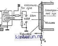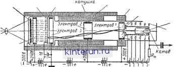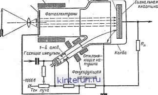 Автоматическая электрика Радиопередающие устройства дое из зерен мозаики после смещения с него луча оказывается заря- Полупрозрачный женным до одинакового катод- (равновесного) потенциала (около -ЬЗ в). Зарядные токи элементарных конденсаторов, пропорциональные освещенности, при коммутации потенциального рельефа электронным лучом протекают по на грузочному сопротивлению и образуют на нем напряжение видеосигнала. Потенциал зерен мозаики после смещения с них луча постепенно убывает и становится таким, каким он был до коммутации. Уменьшение потенциала происходит за счет оседания вторичных электронов, выбитых лучом из других-зерен мозаики и не достигших анода (коллектора). Вторичные электроны, не попавшие на коллектор, образуют перед мозаикой пространственный заряд, который препятствует вылету фотоэлектронов из мозаики под действием светового потока, что существенно уменьшает чувствительность иконоскопа. Используется иконоскоп только при студийных передачах.. При хорошей освещенности передаваемого объекта он позволяет получить высокую четкость изображения и хорошую передачу градаций яркости. К недостаткам иконоскопа, кроме его малой чувствительности, относятся трапецеидальные искажения растра и наличие так называемого черного пятна . Трапецеидальные искажения возникают из-за того, что ось электронного прожектора по отношению к плоскости мозаики расположена под некоторым углом. Для устранения этих искажений ток в строчных отклоняющих катущках иконоскопа модулируется пилообразным напряжением кадровой развертки. Эффект черного пятна (затемнение отдельных участков изображения) возникает из-за неравномерного оседания на мозаику вторичных электронов, не попавших на коллектор. Устраняется черное пятно вводом в телевизионный сигнал компенсирующих сигналов от специального генератора. Иконоскоп с переносом изображения Дальнейшее усовершенствование передающей трубки типа иконоскопа состоит в том, что в качестве светочувствительной поверхности используется не мозаичная мишень, а-сплошной полупрозрачный фотокатод, работающий на просвет (рис. 15-12). Нанесен он в виде тонкой пленки на внутреннюю поверхность передней стенки стеклянного баллона трубки. Катушка переноса Коллектор Диэлектрическая у мишень И усилителю ![]() Рис. 15-12. Передающая трубка иконоскоп с переносом изображения. У задней стенки колбы установлена мишень, представляющая собой тонкую диэлектрическую пластинку, покрытую с обратной стороны металлическим слоем, выполняющим роль сигнального электрода. Поверхность мишени, обращенная к фотокатоду, обладает большим коэффициентом вторичной эмиссии и большим поверхностным сопротивлением. В боковом цилиндрическом отростке, приваренном к колбе, установлена электронная- пушка, формирующая луч. Управление и фокусировка луча производятся так же, как и в иконоскопе. На переднюю часть колбы (непосредственно у фотокатода) надевается длинная фокусирующая катушка (катушка переноса), создающая равномерное магнитное поле. Преобразование оптического изображения в видеосигнал в иконоскопе с переносом изображения происходит следующим образом. На полупрозрачный фотокатод трубки посредством объектива проецируется передаваемое изображение. При этом элементарные участки фотокатода эмитти-руют фотоэлект