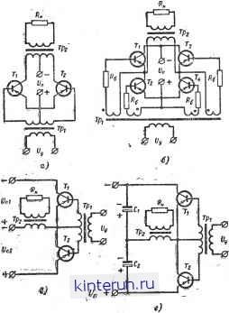 Автоматическая электрика Радиопередающие устройства протекающего в цепи коллектора, /к, определяемому по формуле W к.макс и в цепи базы (17-155) (17-156) ст.мин Действующее значение тока во вторичной обмотке зависит от характера нагрузки. При активной нагрузке или при работе на выпрямитель, ньшолненный по мостовой схеме или схеме удвоения, f 2 = Гамаке, (17-157) а при двухтактном выпрямителе со средней точкой /, = {?iE. (17-158) По вычисленному значению тока определяется диаметр проводов обмоток (17-159) Рассмотрим переходный процесс переключения в транзисторе. Характерным для преобразователя напряжения с самовозбуждением и насыщающимся трансформатором является кратковременное возрастание тока коллектора в момент запирания транзистора. Поскольку транзистор при этом находится в активной области, на нем рассеивается значительная мощность. Основными причинами увеличения тока коллектора силовых транзисторов являются влияние пассивной области базы транзистора и эффект модуляции толщины базовой области [Л. 18]. Амплитудное значение тока коллектора /к.макс =?= б ВстУ, где у-коэффициент, учитывающий инерционные свойства транзистора. Для сплавных низкочастотных транзисторов коэффициент Y >1 и возрастает с увеличением напряжения питания. Для тран-чисторов типов П214, П210 при U = = 1530 е Y=l,31,5. При выборе транзисторов по току необходимо, чтобы расчетное значение тока /к.м не превышало максимально допустимого тока для данного типа транзистора, определяемого по техническим условиям. В преобразователях, выполненных на мощных высокочастотных дрейфовых транзисторах, после выхода транзистора из режима насыщения ток коллектора сразу начинает уменьшаться,. что свидетельствует об отсутствии у дрейфовых транзисторов эффекта модуляции толщины базовой области. -При расчете тока коллектора в этом случае следует принимать Y=l- Фронт выходного напряжения в автогенераторе . с достаточной для инженерной практики точностью можно считать линейным. Длительность его зависит от приведенного сопротивления нагрузки, параметров схемы и частотных свойств транзисторов и определяется по формуле 2Тк б <ф , -; (17-160) н бВст Здесь Тк-постоянная времени транзистора, определяемая в активной области параметрами нормального включения В. Тк=-2. (17-161) где f - граничная частота транзистора. Для получения в преобразователе выходного напряжения с короткими фронтами необходимо применять высокочастотные транзисторы с малым Тк или транзисторы с большим коэффициентом усиленпя по току (Вот)- Из уравнений (17-160) и (17-137) видно, что сократить время переключения транзистора и облегчить запуск преобразователя можно, уменьшая сопротивление резистора Re в цепи базы. Достигается это шунтированием резисторов R6 конденсаторами Сб. На участке выключения, при наличии конденсаторов Сб, когда транзистор выходит из режима насыщения и напряжения на базовых обмотках начинают уменьшаться, к переходу эмиттер - база закрывающегося транзистора прикладывается обратное напряжение, равное разности напряжений на конденсаторе и на базовой обмотке. Через базовую цепь транзистора начинает протекать обратный ток, вызывающий рассасывание избыточных носителей из базовой области. В результате протекания обратного тока через базовую цепь транзистора длительность процесса выключения существенно сокращается. После смены